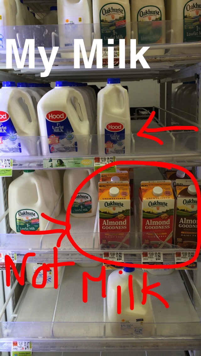 1) Maine, with all its almond trees*, is now home to Almond Goodness from Oakhurst….and apparently the best place for the Almond Goodness of Maine is in the dairy case next to my milk. Just for clarification, my milk comes from cows. The Filtered Water, Almonds, Natural Flavor, Sea Salt, Gellan Gum, Xantham Gum, Sunflower Lecithin, Calcium Carbonate, Vitamin E Acetate, Zinc Gluconate, Vitamin A Palmitate, Vitamin B12 and Vitamin D2 comes from…well I am not sure where it comes from, but it doesn’t come from Maine and it sure as hell don’t come from cows, though the Oakhurst peeps are pretty adamant that “All of our milk is sourced from local farms in Maine and Northern New England.” So now I am confused. If you are curious as to where it comes from and why it’s in the dairy case with REAL milk I am sure the folks at Oakhurst would be a font of information…you can contact them by phone: (207) 772-7468 or by email.
